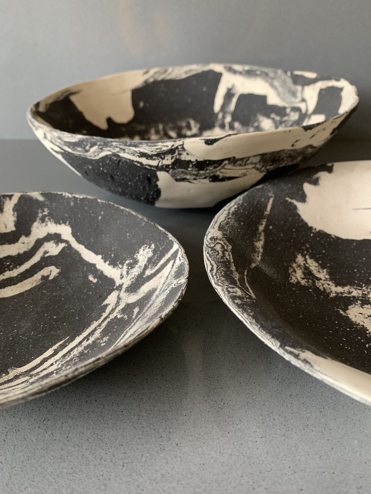 Ambas técnicas exigen precisión y planificación previa. El nerikomi es una técnica de construcción a mano que implica muchos pasos: teñir la arcilla en distintos colores, crear y comprimir bloques de arcilla con patrones y, después, utilizar finas láminas de ese bloque para construir una forma. El neriage también empieza teñiendo la arcilla, pero el proceso de combinarla es un poco más libre. El resultado es una arcilla marmoleada que puedes usar para tornear, viendo cómo el movimiento al torno alarga de forma natural los diseños. Ninguna de las dos técnicas es rápida y ambas tienen una curva de aprendizaje, pero los resultados pueden ser extraordinarios.